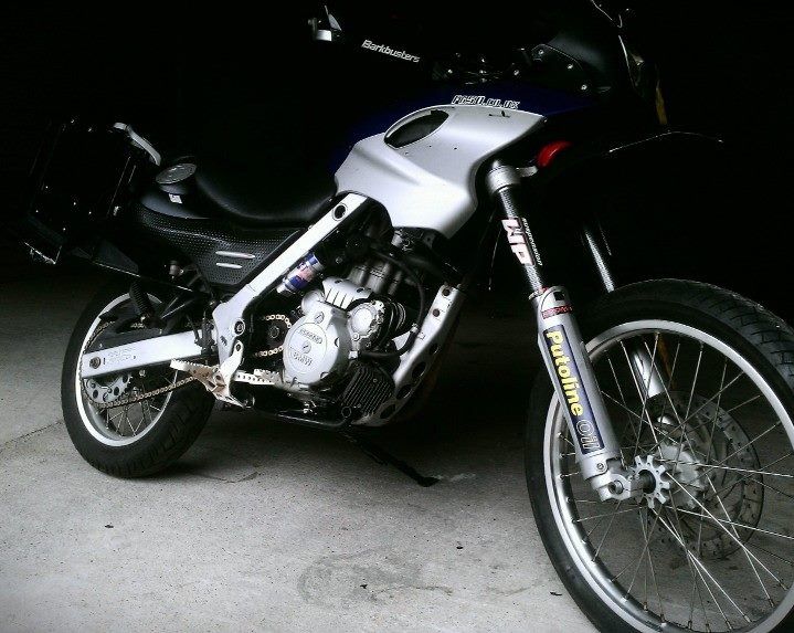 -Compré barras de horquilla WP (***********) de una CCM 644 de 2001. Usan un eje de 17MM que es el mismo que el de BMW, por lo que se adapta a los rodamientos de las ruedas BMW. Mi mecánico de horquillas dijo que no tendría sentido gastar mucho dinero en revalvulados y muelles, ya que ya están muy cerca de estar valvulados y con muelles para el peso de BMW de todos modos.