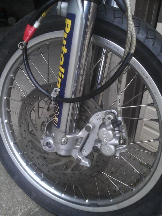 -Compré un soporte de freno KTM del lado derecho de una KTM 640 Adventure (KTM y BMW usan el mismo freno Brembo), esto es para poder usar el disco original BMW de 300MM. Pero tendrás que quitar las arandelas de los pernos del disco o golpearán la pinza cuando la rueda gire.