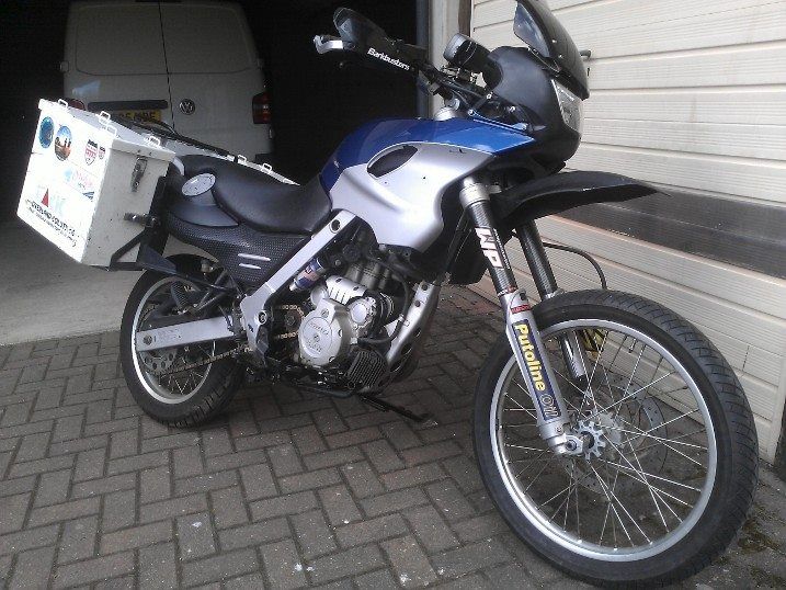 Touratech vende el kit para hacer esto por... y prepárense para esto... 3200 libras, mientras que el coste total de todas mis piezas; horquillas, tijas, soporte, latiguillo de freno, husillo y mecanizado me ha costado un total de 412 libras, ¡una ganga!
